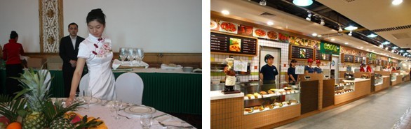 即以各地風(fēng)味菜肴為主,品種達(dá)到50一60個,涼菜、熱菜、面食、粥、湯等均為明檔擺放。熱菜由廚房制作,擺入明檔。優(yōu)勢在于集超市自選與餐飲現(xiàn)場制作為一體。顧客在選擇、觀看過程中完成取餐、進(jìn)餐過程。